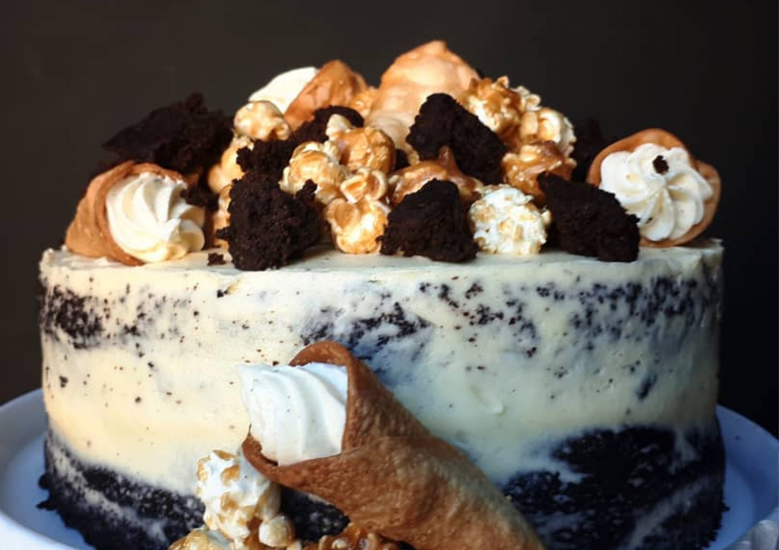 Black Dark Chocolate Sponge with Vanilla buttercream, Caramel Drip & Caramel Popcorn