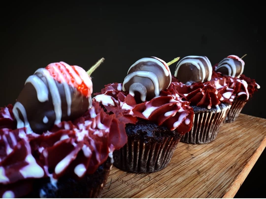 Dark Chocolate Cupcakes, Red Velvet Buttercream, Dipped Strawberries(seasonal)