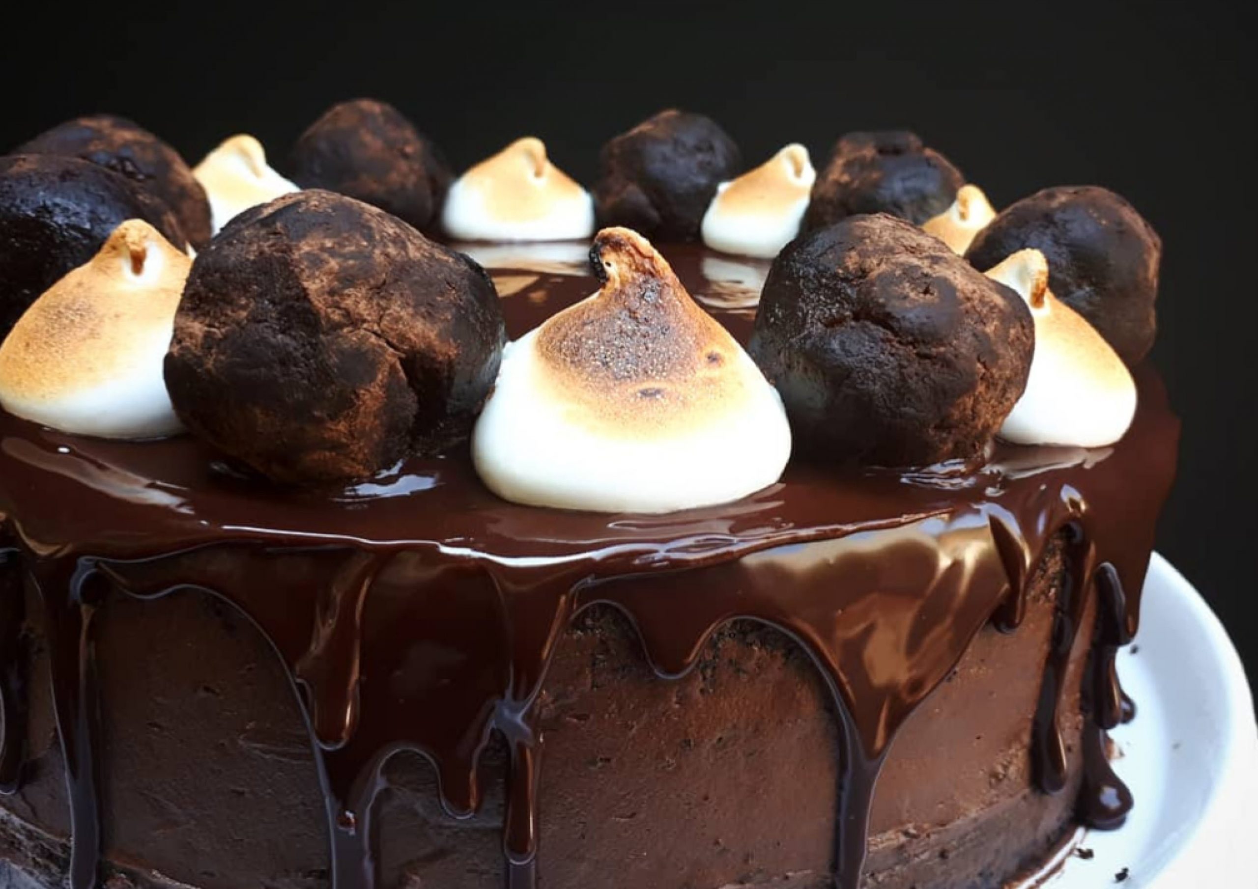 Dark Chocolate Sponge with Milk Chocolate Buttercream, topped with Dark Chocolate Ganaché & Brownie Truffles.