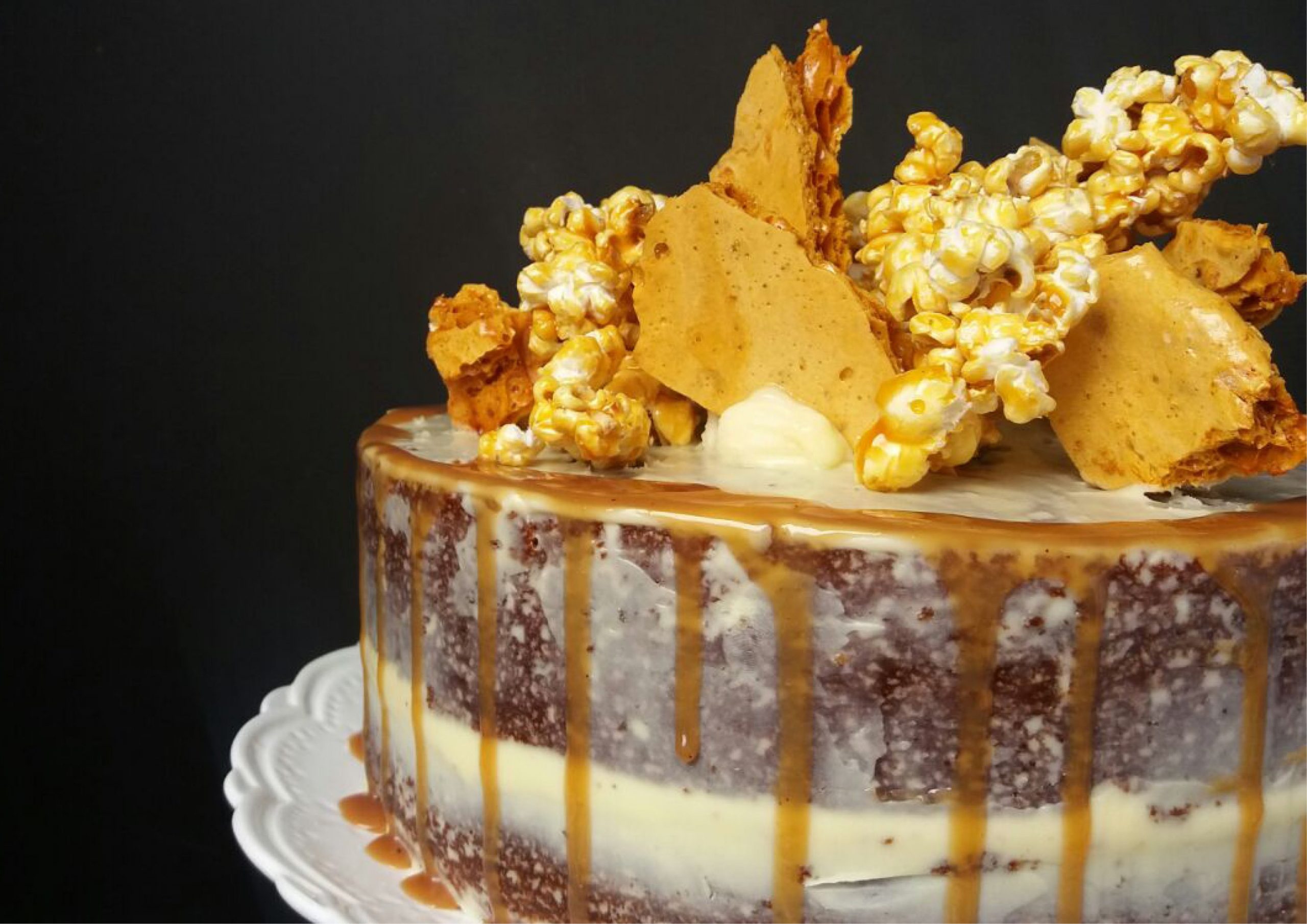 Vanilla Sponge, Cream Cheese Frosting and a Caramel Drip.